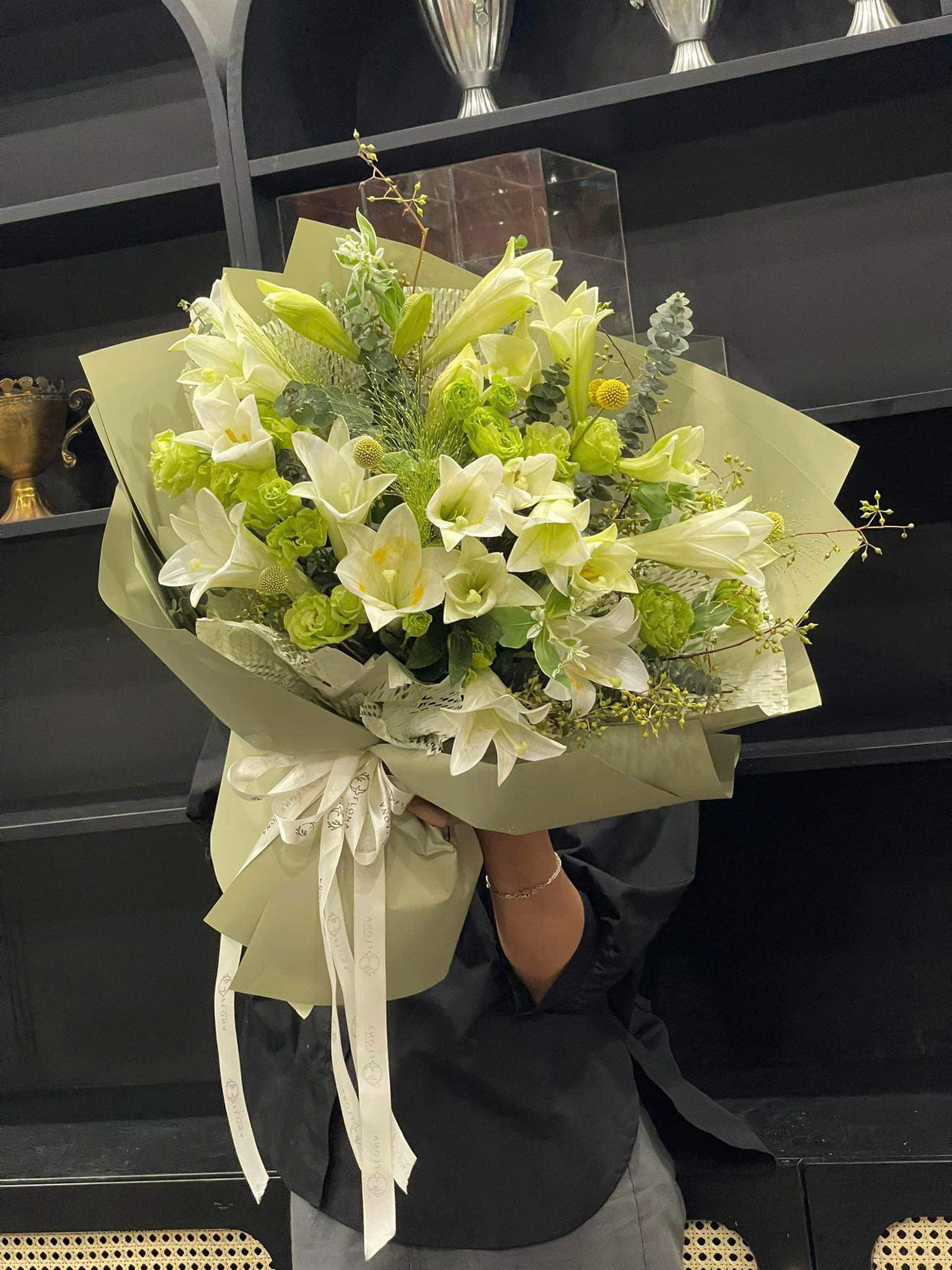 Những cánh Lily (hoa ly) và Eustoma (hoa cát tường) mềm mại đan xen cùng Eucalyptus (bạch đàn) — tất cả như lời thì thầm của thiên nhiên, nhẹ nhàng mà đầy sức sống.