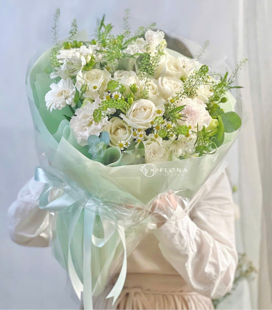 Thanh khiết và nhẹ nhàng như hơi thở đầu ngày, White Roses kết hợp giữa Hoa hồng trắng, Lisianthus (Hoa cát tường trắng) và Chamomile (Hoa cúc chi) nhỏ xinh. Sắc trắng hòa cùng tông xanh dịu như giai điệu yên bình của thiên nhiên – mang đến cảm giác tươi mát, trong trẻo và đầy an lành cho người nhận.